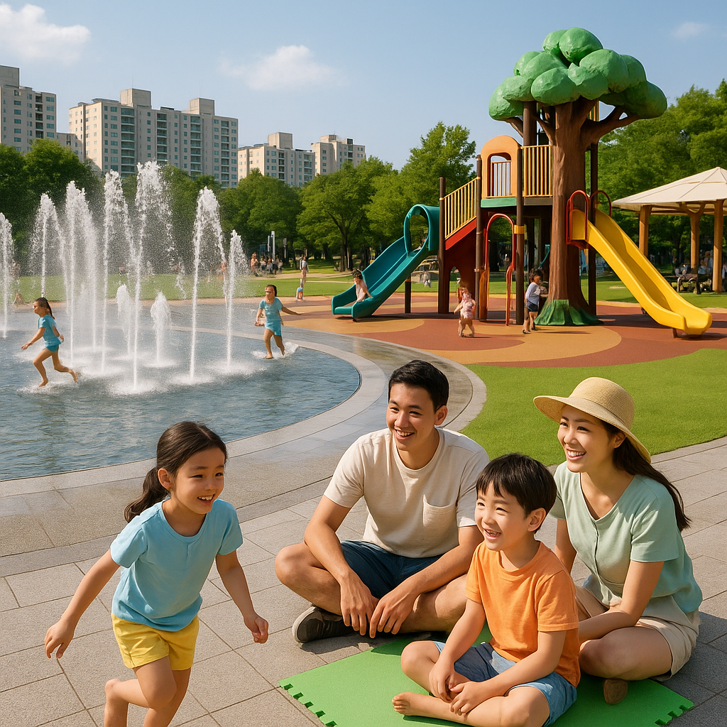 도심 한가운데 초대형 공원. 바닥분수, 안개분수, 계절형 물놀이터(운영 시) + 테마 놀이터들이 이어져 ‘한 바퀴 코스’ 돌리면 시간순삭.