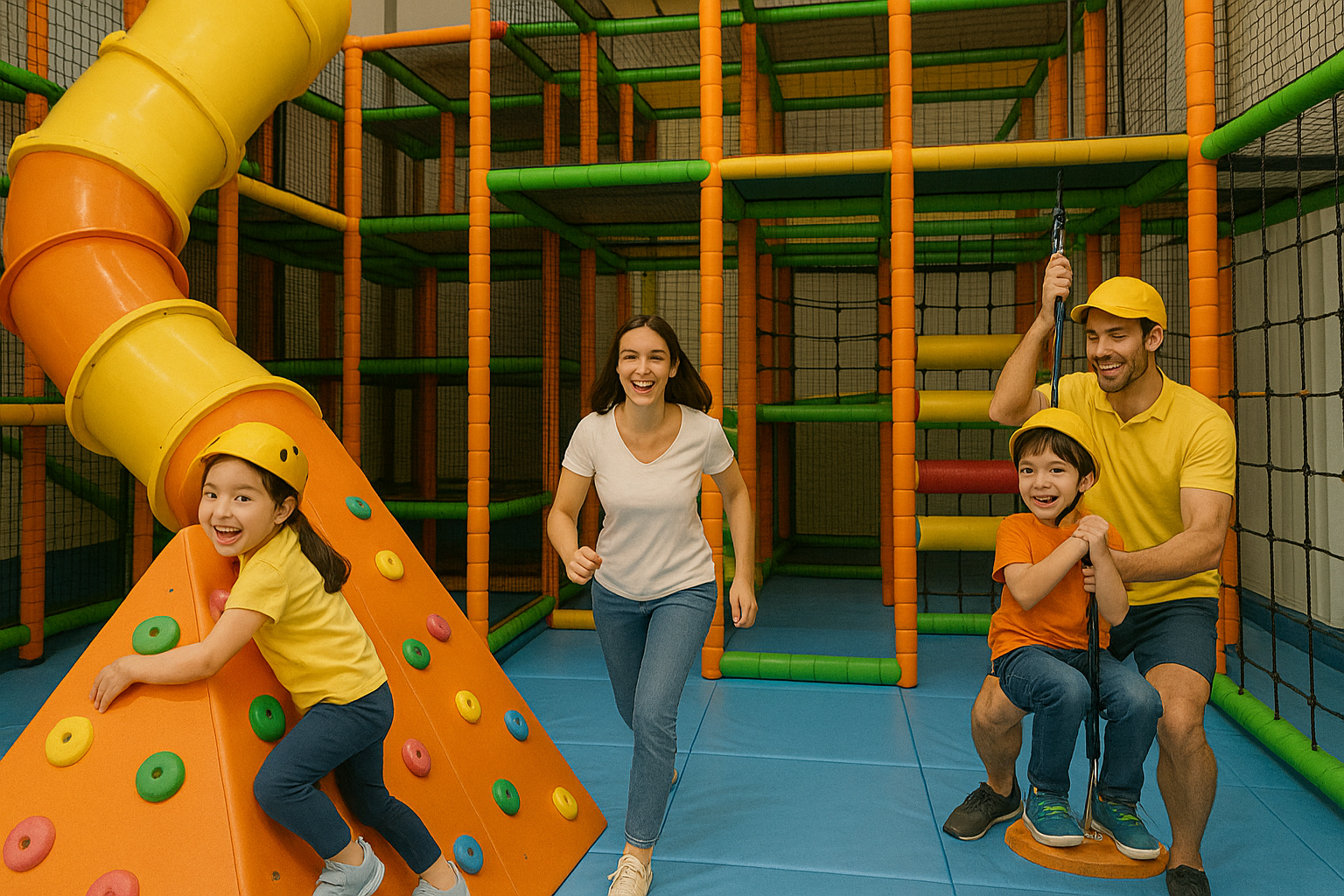실내 짚라인 코스가 길고, 중간에 암벽·밧줄·미끄럼틀이 연결돼 있어 ‘모험 루트’ 느낌을 줍니다.